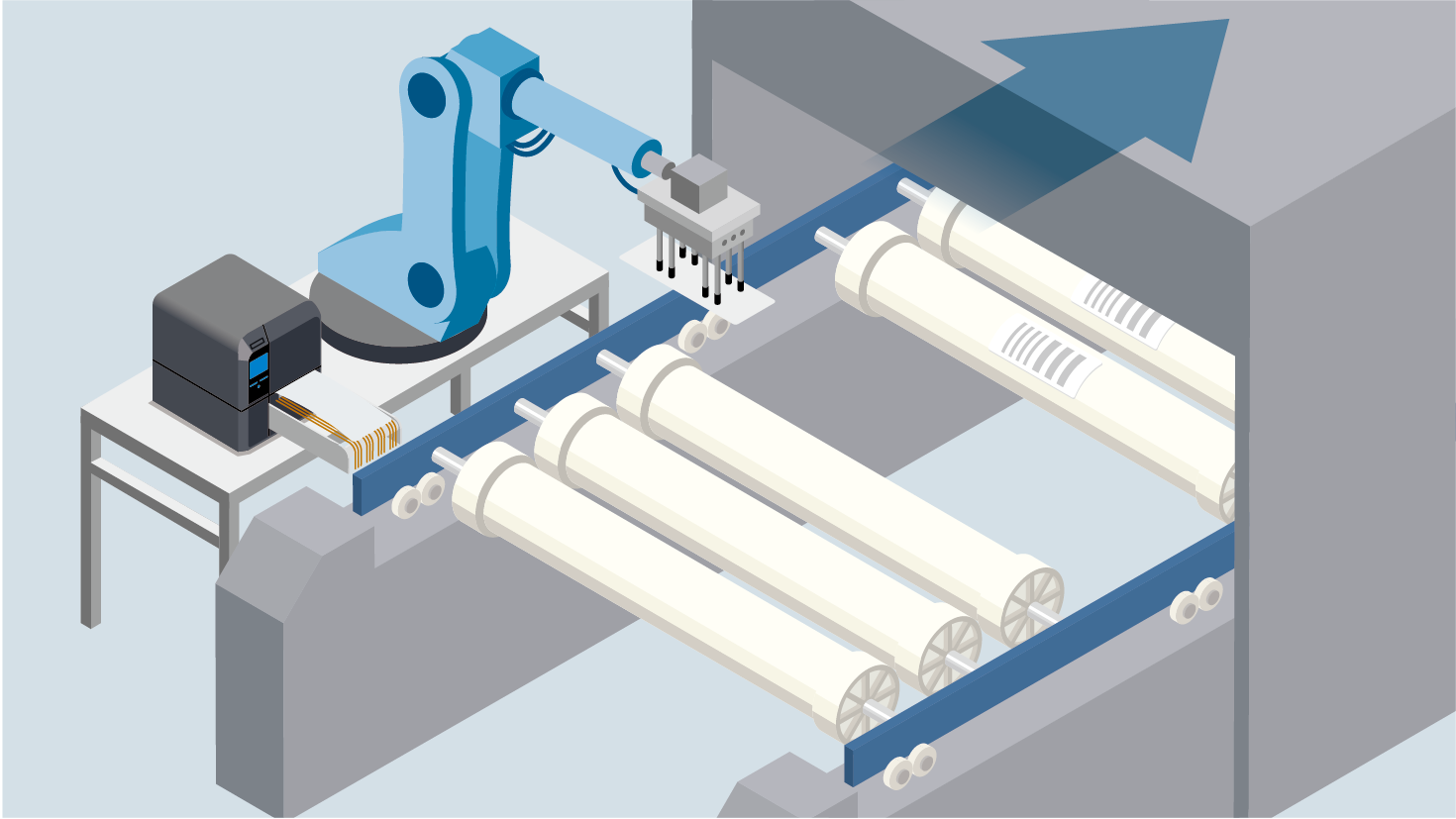 The customer, a water filtration manufacturer, faced significant challenges due to changes in work styles, evolving workplaces, an aging workforce, and a labor shortage. These factors created a pressing need for factory automation to meet increasing product demand amid a limited labor pool. The objective was to implement a fully automated production line covering tasks from water filter membrane winding to labeling, ensuring continuous 24/7 operation and improved production efficiency. A critical challenge was integrating the newly automated processes seamlessly with the customer’s existing processes with a new RFID-powered management system.